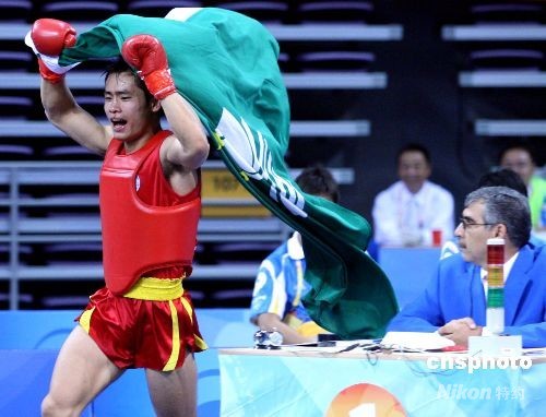 8月24日上午,中国澳门选手蔡良蝉在“北京2008武术”男子70公斤级散手比赛中获得金牌后,身披区旗在场上奔跑,欢庆胜利。中新社发 宋吉河 摄