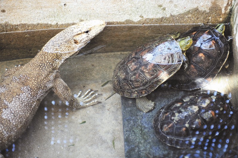 此时,1米多长、6斤来重的巨蜥正“懒洋洋”地呆在家里乘凉。巨蜥的家有一条长长的水槽,中间用石头隔了起来,一小半放沙土,住着巨蜥;另一大半则注满了水。突然一下子来了这么多的乌龟,巨蜥显然提高了警惕,不停地吐着信子,而乌龟们也显得有些“害怕”,纷纷聚在一起。这时,一只小乌龟突然爬到了巨蜥跟前,“傻傻”地望着巨蜥,并不停地摇晃四肢,还时不时地伸出短小的前腿拍拍巨蜥,向巨蜥发出了“友好”的信号,本就“性格温顺”的巨蜥逐渐接受了龟群的到来。