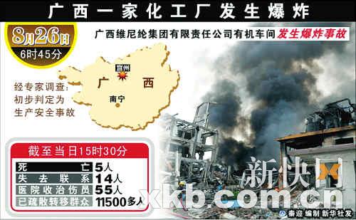 8月26日6时45分,广西维尼纶集团有限责任公司有机车间发生爆炸事故,爆炸引发的火灾导致车间内装有甲醇、乙炔、醋酸乙烯、液氯等易燃易爆物品的储存罐爆炸。