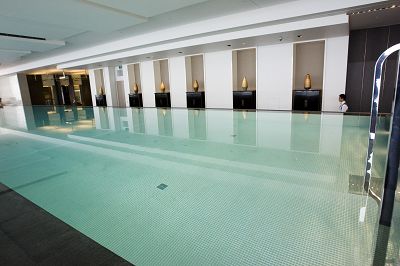 从86层乘坐酒店专用电梯到达85层,该层名为水镜,包括泳池、太极园和健身中心。泳池占了楼面相当大的面积,无边际游泳池内的水不停向外满溢出来,整个泳池表面犹如明镜覆盖在上面,旁边是日本特色的按摩浴池和足浴。搭乘电梯到达79层客房,步入一间客房,迎面是化妆间,左手边是卧室,右手边是卫生间,卧室一侧,落地窗朝向西面,东方明珠、黄浦江一览无余,窗边是羊皮表面的写字台,大床跟落地窗对着。每个客房都有咖啡机,投入不用拆包装的绿色真空锡纸包装的圆形“咖啡胶囊”,即可泡上一杯咖啡,咖啡浓淡,住客可自行选择。