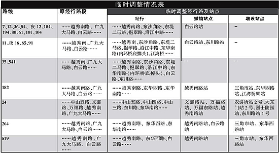 新快报讯 (记者 陈志龙)因广九大马路道路施工需临时改为东往西单行,广州市交通部门决定临时调整公共汽车7路等21条线路的经行路段及站点。