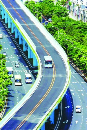 厦门昨日开通的快速公交系统最大的特色是,在闹市区建设高架桥,其他地段设置专用道,而且全程不设红绿灯。这样既保证了快速公交拥有全程封闭的专有路权,又克服了城市公交最难解决的与其他车辆及行人相互干扰的弊端,从而保障了快速公交车的畅行和准点。