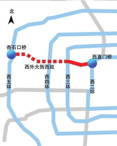 本报讯(记者郭鲲)昨天,记者从市交通委获悉,西直门外大街快速路二期(见右图)将于年内开工,届时西外大街将西延到西五环路杏石口桥。(更多精彩新闻 请访问京华网www.jinghua.cn)