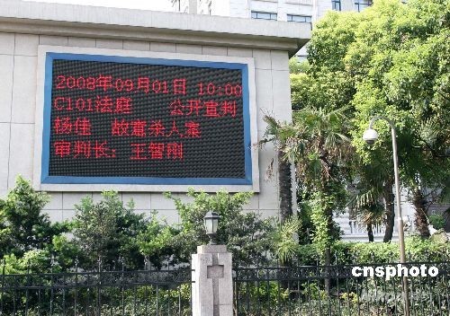 备受世人关注的杨佳袭警案9月1日作出一审判决,上海市第二中级人民法院以故意杀人罪判处杨佳死刑。图为当日法庭外的电子公告。中新社发 潘索菲 摄