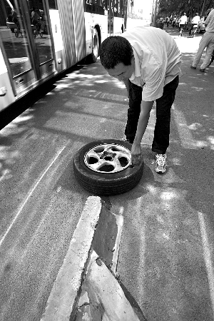 昨日11时许,出租车司机王师傅愁眉苦脸地站在朝阳区文化馆路西口南侧,面前摆着一个破了口子的轮胎。王先生说,10时许,他载着客人在该处右转上辅路,“刚转过就听见砰的一声,下车一看,刚换了一个月的车胎报废了”。