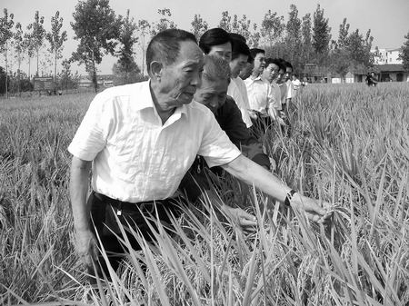 袁隆平(前一)昨天在信阳商城县察看超级杂交水稻生长情况