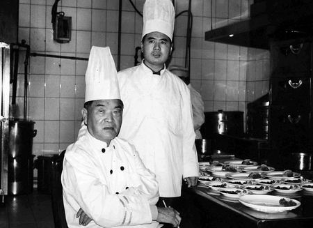 ▲钓鱼台国宾馆原总厨师长侯瑞轩与徒弟李志顺合影