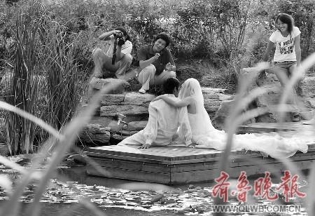 2日下午,在济宁市人民公园内,一家影楼的摄影师正在为一对新人拍摄外景婚纱照。随着济宁市人民公园二期工程的逐步完善,市区内一对对情侣纷纷到此来拍摄婚纱照,记者发现,仅仅一下午的时间,就有5对新人前来争“揽”公园美景。