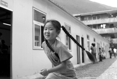 汉中市略阳县高台小学,一名小学生在活动板房教室前玩耍