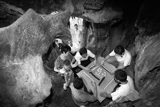昨日,浏阳古港镇新园村,胸径4.06米的千年古樟的树洞可摆上一个麻将桌,当地居民正在树洞里面打麻将。
