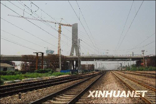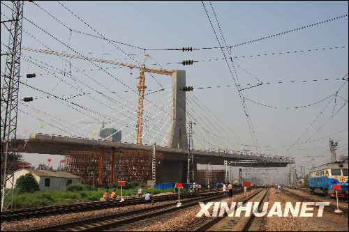 9月4日上午11时20分左右,由中国中铁七局三公司承建的石家庄市环城公路跨石太铁路转体斜拉桥成功转体,与铁路两侧的桥梁实现成功对接,转体斜拉桥转体重量16500吨、转体角度达75点74度,两项指标均居世界同类桥梁之最。 新华社发(罗铁锁摄)