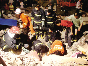 据目击者描述,当时只听“轰隆”一声,几乎一瞬间,房屋如搭建的积木一样突然倾斜过去,二楼一下倒在一楼的院坝上。两户人家的四个孩子和一位老人被泥石吞噬。周围的村民立即找来铁锹等物挖掘。很快,一名老妪被救出,毫发无损。随后,又有两名孩子被接出,但因伤势过重不幸死亡。