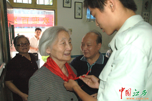 同学们为李老师又戴上红领巾!(江西网记者 邓小勇 摄)