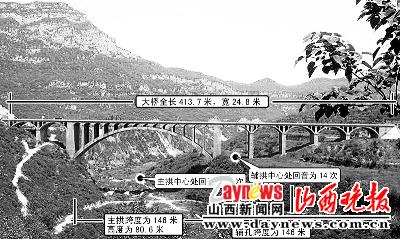 接到电话后,记者于当日上午11时驱车来到位于晋城市区东部11公里处的丹河大桥。丹河大桥横卧苍山峻岭之间,与著名的青莲寺及珏山风景区相邻。这座主孔净跨径146米的桥梁,为全空腹式变截面石板拱桥。在146米净跨径主孔拱桥的两端,分别还有两个和5个跨径为30米辅拱分列南北两端。这座全长413.7米、桥面宽度24.8米的桥梁,主拱距地面高度80.6米。如今,该桥以“当今世界上跨径最大的石拱桥”,被正式列入吉尼斯世界纪录。