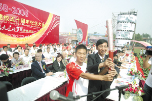 该校2006级在读研究生徐伟代表天津工业大学参加了2008北京奥运会天津市火炬接力活动。在昨天举行的天津工大建校五十周年庆典上,这位全国优秀大学生将自己曾经擎举的火炬献给了自己的母校,表达对母校和老师的崇高敬意和美好的祝福。