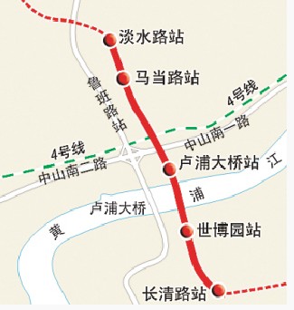 据了解,这条世博专用线长约5公里,从北至南依次设淡水路站、马当路站、卢浦大桥站、世博园站和长清路站,共5站4区间。其中在淡水路站与10号线相交,在马当路站与9号线相交,在长清路站与7号线相交。