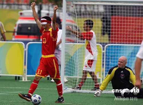 9月7日中午,北京残奥会五人制(男子)足球小组赛在北京奥林匹克公园内的曲棍球场举行,中国队以绝对优势3比0击败英国队,11号前锋王亚锋独中两元。残奥会五人制(男子)足球赛的参赛队由四名盲人球员与一名非盲人守门员组成,盲人球员全凭刻苦的训练与对足球的感觉在场上寻找攻破对方大门的机会。中新社发 任晨鸣 摄