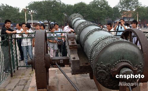 9月8日,众多游客在北京故宫午门前观看代表清代铸炮最高水平的“武成永固大将军”铜炮。“武成永固大将军”铜炮是大清康熙二十八年(1689年)铸造。其炮长3.55米 、口径15.5厘米,用药10斤,生铁炮子20斤。此炮为康熙皇帝钦定制造,共铸61门。当时制法官为比利时裔工部侍郎南怀仁,掌管此铸炮事;工匠为李文德、颜四。该炮的花纹具有中西合璧特色,为车载攻城专用的“红衣炮”,即属明清时仿制欧洲的火炮系列。中新社发 邹宪 摄