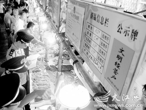 9月5日,南昌市工商部门在公园路等地菜场进行“一标三挂”检查,对长期诚信守法的经营户授予“诚信经营户”牌,对未被投诉但又达不到诚信经营户标准的授予“文明经营户”牌。王斌 本报记者海波摄