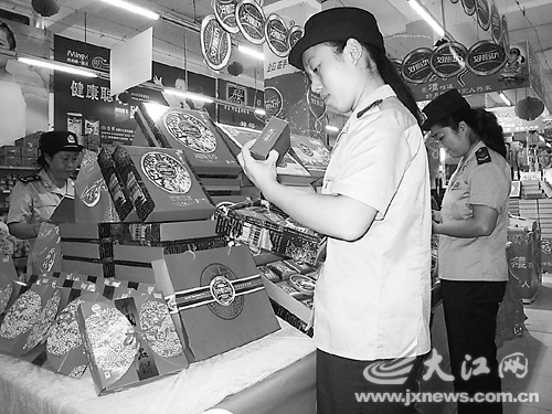 中秋节临近,赣州各地积极整合工商、质监、卫生等相关部门的力量,对食品、旅游、文化市场进行专项检查,营造和谐安全的消费环境。图为安远县工商局欣山分局执法人员在对超市销售的月饼进行检查。刘魏 本报记者梁健摄
