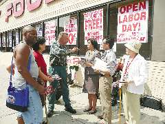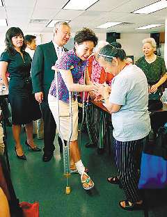 图为拄着拐杖的杨爱伦,仍密集走访社区。(美国《世界日报》档案图片)