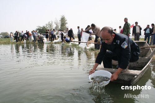 9月9日,由人工繁育的20万尾新疆扁吻鱼幼苗在新疆拜城县克孜尔水库被放养。此放养的20万尾扁吻鱼鱼苗,是今年5月初经新疆水产科学研究所和阿克苏地区水利局渔政科研人员精心观察、挑选、受精、催产,11尾扁吻鱼种鱼产下59.2多万受精卵人工繁殖取得的历史性成果。与以往的放养不同,这批幼鱼鱼苗规格已经达到体长10.75厘米,尾重平均为9.2克,放养的规格和数量较前几次有明显增大,将大大提高放养效果。中新社发崔玉永 摄