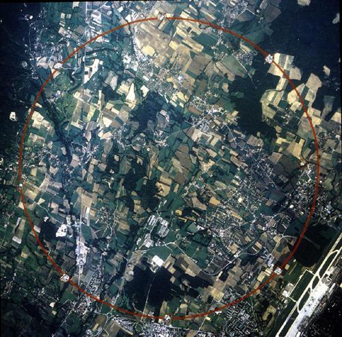 大型粒子对撞机位于瑞士、法国边境地下100米深的环形隧道中,隧道全长达27公里