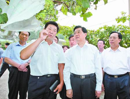 9月9日,中共中央总书记、国家主席、中央军委主席胡锦涛在省委书记徐光春、代省长郭庚茂、省委副书记陈全国陪同下,来到博爱县海林葡萄专业合作社详细了解葡萄长势。