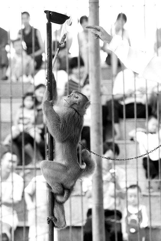 终于到了猴王大展身手的时候。它右手高举着一支火把,任务就是点亮放在一米多高的木棍上的火盆。猴子天性怕火,猴王从前也是看到火就跑。为了让猴王表演好“点火”的节目,驯兽师们可是花了很大的功夫。