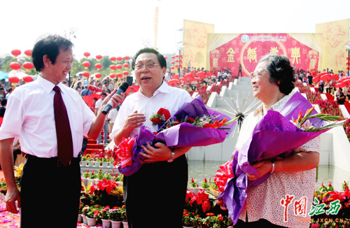 15日上午,“情暖秋月”金婚庆典在宜春袁山公园举行。中国科学院院士、中国著名天体化学和地球化学家、中国月球探测工程首席科学家欧阳自远作为金婚伉俪应邀出席了金婚大典。(江西网记者 邓小勇 摄)