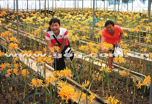 金黔在线讯 9月15日,记者在贵阳市郊乌当区百宜乡花卉基地看到,一个个花卉大棚里,金花石蒜繁华盛开,引来不少度假市民驻足欣赏。