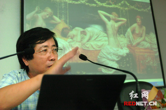 (中央美术学院易鹰教授在湖南大学名为《印象派与后古典主义》的学术报告会上,评说欧洲各画派的历史。)