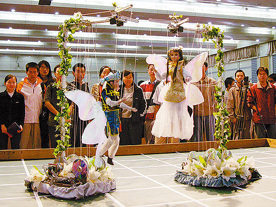 中国科大被誉为“机器人之乡”,科大蓝鹰队曾夺得第11届RoboCup机器人世界杯两项冠军、一项亚军、一个第4名。图为中国科大Robo-Game活动周上学生研制的机器人在表演提线木偶剧。