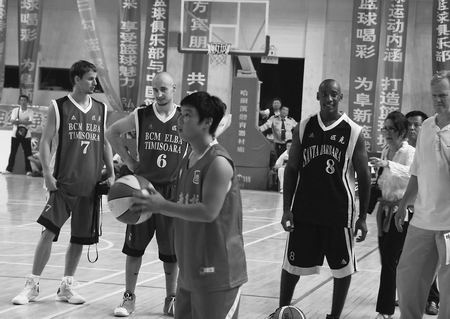 宋何景与美国球员在友谊赛中