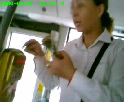 约2分钟后,车到沪闵路报春路站,上来4位乘客,都用现金买票。这次,售票员卖完票后,没撕一张票给乘客。)