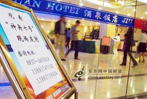 在酒泉某四星级宾馆的大门前,一张告示牌赫然醒目:观看“神州七号”现场发射。记者按图索骥找到这家旅行社,接待人员黄小姐说,他们确在组织9月25日观看“神七”发射的旅行团,当日往返每人收费1000元,目前已有十几个人报名。
