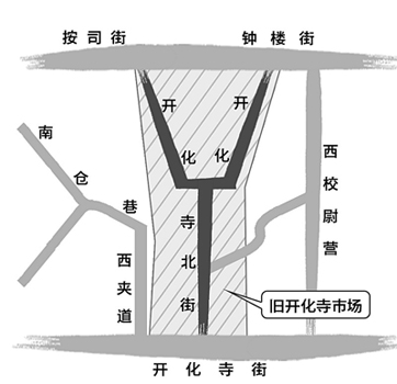 因为当年的开化寺街与后来的开化寺北街,无重叠演变关系,姑且搁置一边,不去理会。而当年的“开化市”却与后来的“开化寺北街”,地域大致重叠,有沿革关系,所以需简述如后。