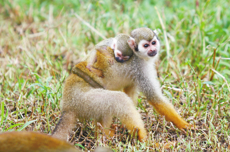 与别的小猴习惯钻在妈妈怀里不一样,松鼠猴宝宝喜欢趴在母猴背上。最近一个多月来,动物园里共有5只小松鼠猴出生,母猴把自己的幼仔背在背上,在树木、草丛之间欢跳。松鼠猴原产地是在南美洲。