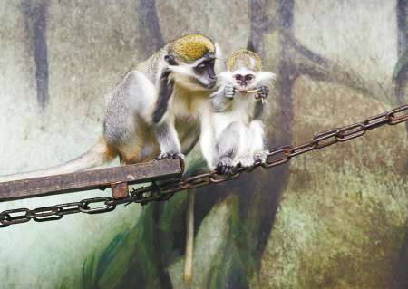 昨天,记者在动物园珍猴馆里看到,分别产于今年6月与8月的两只绿猴宝宝已经行动自如了,它们时常淘气地拿着小东西和妈妈一起玩。绿猴胆子挺大,有时竟跳到玻璃窗旁坐着,与游客近距离地“大眼瞪小眼”。绿猴原产自非洲,生活在靠近河流和溪流的热带草原地区,据说是在地上跑得最快的猴类。