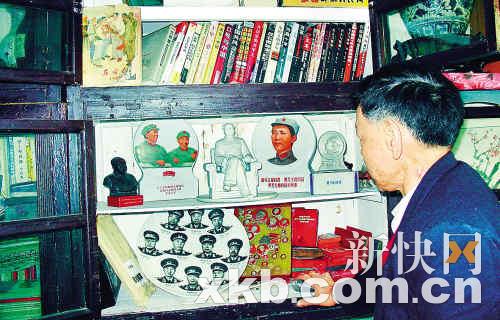 新快报讯 (记者 程辛 文/图)住康乐路一位姓李的先生是一个毛主席迷,几十年来家里不但收藏了200多枚毛主席像章,还专门腾出了一个柜子装他收藏的毛主席的塑像和印有毛主席像的陶瓷,目前,他正在研究一些文革时期的书籍,准备写书。