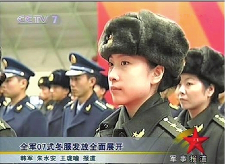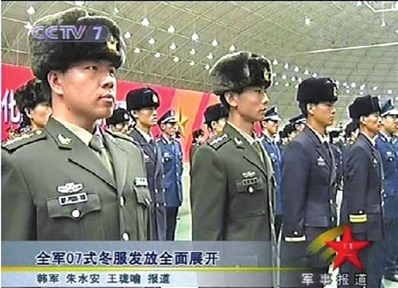 我军07式冬服发放工作正在陆续展开,20年基本不变的87式冬服即将退出舞台。这款07式军装相当有型,已引发网友的热烈追捧。9月19日,沈阳军区开始发放07式冬服,网友们把央视军事频道的视频截图放到网上(如图),以《大国军人的风采》、《07式很酷很帅》等为题发帖,引起很大轰动,网友纷纷赞叹“漂亮”、“有型”、“显军威”!从1950年统一军服制式以来,中国军服先后12次调整改革,冬服上次大规模换装还是87式。