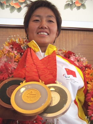 在去年的第七届残运会上,周洪转一举拿下4枚金牌,并打破一项世界纪录和3项全国纪录,本报曾经以《黄骅残疾农家女期待08精彩》为题进行了报道。而周洪转也果然没让所有关心她的人失望,在刚刚结束的北京残奥会上,她在女子T53级800米、400米和200米比赛中摘下了金、银、铜3块残奥奖牌!