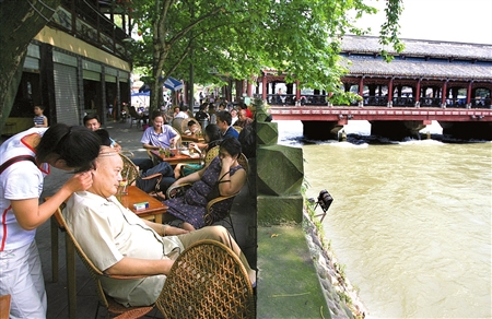 都江堰沿岸茶座休闲市民很多(资料图片谭曦摄)