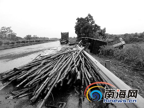 记者早上赶到现场,道路已经恢复畅通,交警部门在道路上设置了警示标志。路边散落着一些汽车零件和木料(见上图,李关平摄),高速围栏杆被撞出了近10米的口子,两辆大型运输车前后相连,侧翻并陷进在农田里。其中,在前面的运输车上运载的是满车的木料,后面的运输车上满载的石料全部倒进农田里,车头已经扭曲变形。停在路边的一辆皮卡车的后车厢也被撞凹进去。