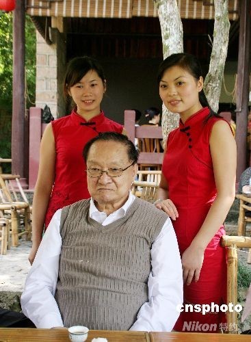 9月25日,中国著名小说家金庸先生在福建武夷山与茶艺小姐合影。中新社发 周文杰 摄