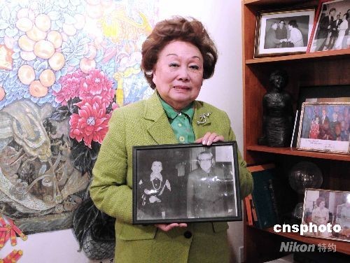 在纪念廖承志诞辰一百周年的日子,美籍华人领袖陈香梅接受本社记者专访,回忆与堂舅廖承志先生的家庭往事。图为陈香梅向记者展示她珍藏二十八年的当年和廖公见面的合影。中新社发 邱江波 摄