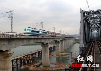 洣河即洣水,是湘江的主要支流之一,因流经炎帝陵而被世人称为“圣水河”,在湖南省衡东县境内汇入湘江。就在两江交汇处,京广线横跨而过。据中铁二十五局集团施工负责人介绍,老洣河桥建于上世纪30年代,是目前已知的京广线年代最久的大桥。由于历史条件所限,技术标准低,虽经多次维修改造,但还是远远不能适应京广大动脉的提速要求。为确保行车安全,列车经过时只能减速行驶,成为京广大动脉南段主要的瓶颈之一。