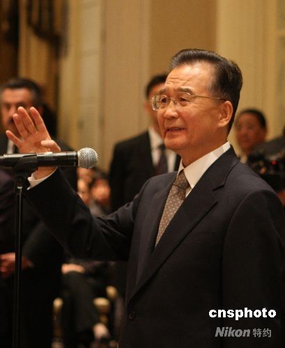 9月23日下午,中国总理温家宝在纽约会见华人华侨、驻外机构工作人员、留学生和中资机构代表时谈今年中国“三件大事”:汶川地震、北京奥运会和“奶粉事件”。中新社发 李静 摄
