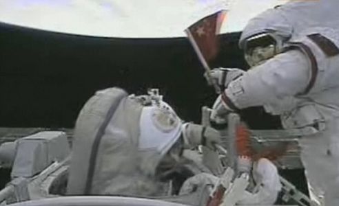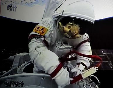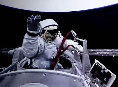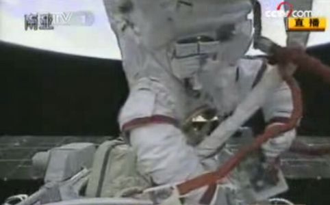 身着中国“飞天”舱外航天服的翟志刚头先脚后飘出母船——神舟七号,沿轨道舱壁开始活动。把红色的安全系绳挂钩挂在飞船舱外的出舱扶手上之后,翟志刚上半身露出飞船,并向摄像机挥手致意。