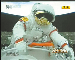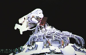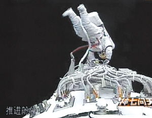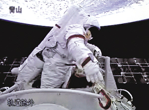 16时35分,翟志刚开启轨道舱舱门,穿着我国研制的“飞天”舱外航天服以头先出的方式实施出舱活动。北京飞控中心指控大厅前方大屏幕显示出从飞船上传回的画面,翟志刚面向安装在飞船推进舱的摄像机挥手致意,向全国人民问好,向全世界人民问好。接着,他接过刘伯明递上的五星红旗挥舞摇动。随后,他朝轨道舱固体润滑材料试验样品安装处缓缓移动,取回样品,递给航天员刘伯明。
